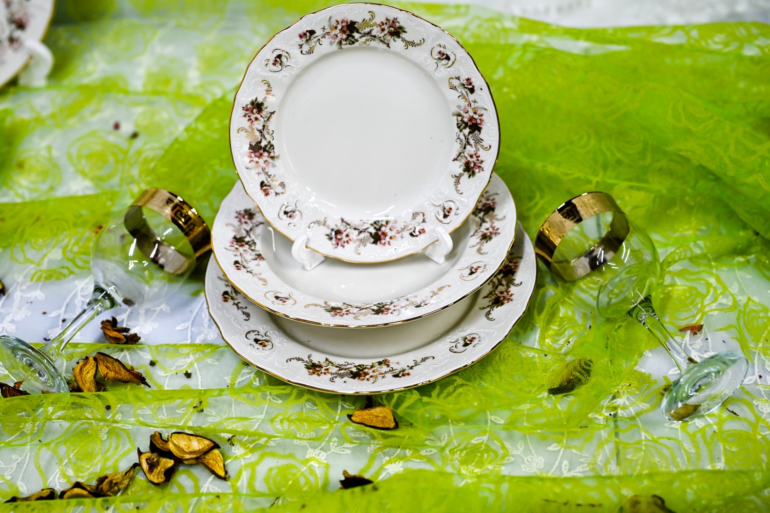 סט 18 צלחות מסדרת חום עלה ירוק עשוי פורצלן צ’כי תוצרת צ’כיה. עיצוב אלגנטי עם פס זהב ונגיעות ירוקות המעניק מראה חמים ויוקרתי.